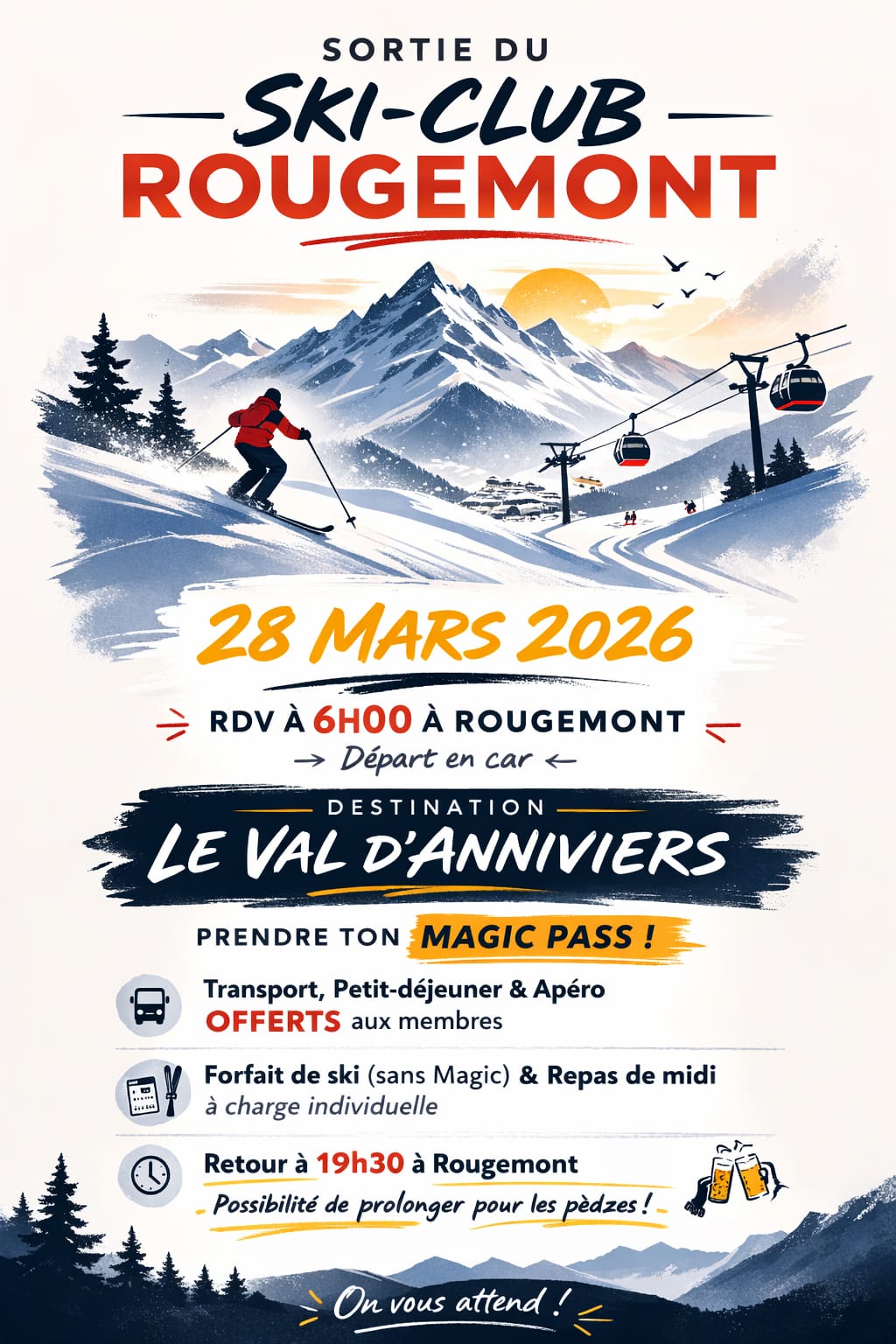 Inscriptions jusqu’au 10 février auprès de Marielle 079 609 32 97 ou par mail info@skiclubrougemont.ch.